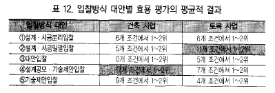 국내 건축 및 토목 전문가 265인 설문조사 결과는 설계공모 기술제안 입찰 혹은 설계시공 일괄입찰이 가장 ‘효용성’이 높다는 결론이 도출되었습니다.