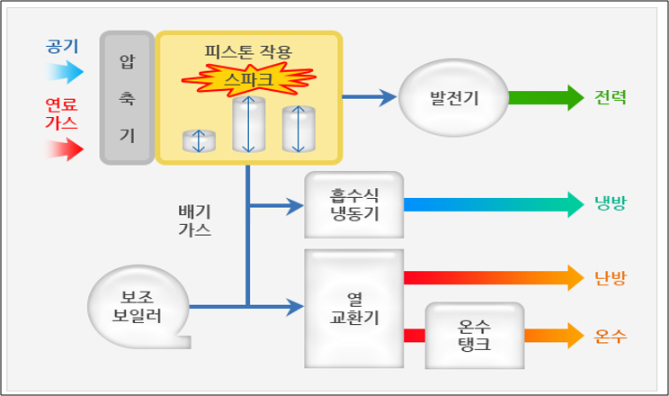 가스엔진 발전효율 : 30~38% 배열이용가능효율 : 45~50% 배열 : 온수 용량 : 8kW~5,000kW 용도 : 병원, 호텔, 체육시설, 복합빌딩, 업무빌딩, 상업빌딩 특징 : 연료가스를 실린더 내로 흡입공기와 혼합하여 실린더 내부에서 피스톤에 의해 압축시킨 후 전기스파크에 의해 연소되는 방식