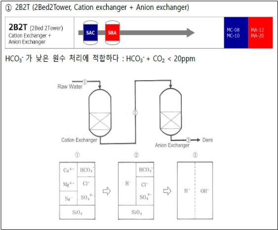 ① 강산성: 교환기로 황산을 사용하며 전 pH범위에서 양이온을 교환할 수 있음 (가장 폭 넓게 사용)