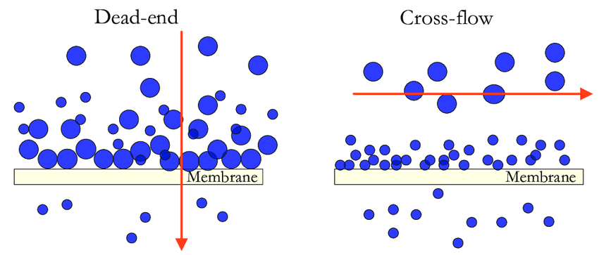 - Filtration while feed water crosses membrane surface